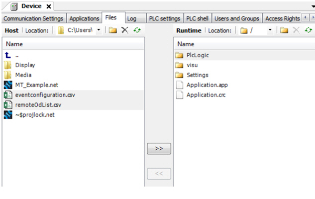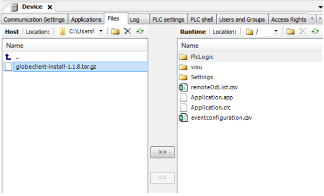Compile the CODESYS application and download it to the 6000 series unit. Copy the MultiTool Creator generated GlobE configuration files eventconfiguration.csv and remoteOdList.csv to the user application folder.