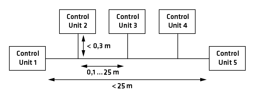 Example 2. Control system topology in theory with maximum bus speed (1000 kbit/s); Control Units in traditional bus arrangement. For more information about the bus speeds, refer to CiA DS-102 standard.
