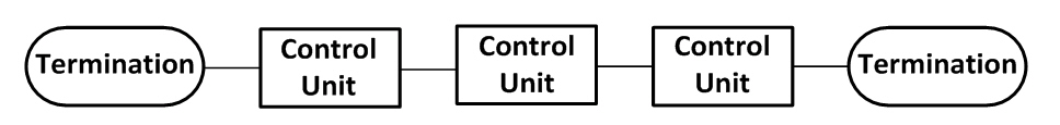 Example 2. Control system topology in theory with maximum bus speed (1000 kbit/s); Control Units in traditional bus arrangement. Termination resistor must be connected at control unit 1 and control unit 5. For more information about the bus speeds, refer to CiA DS-102 standard.