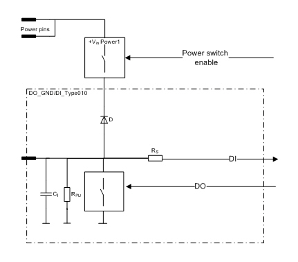When using this type of pin, the related power switch must be switched on as well. See related power switches in section I/O List table's column named Group. Before the supply voltage can be connected to an output pin, the related power switch must be on. If the related power switch is off, the pin's input state is 1 (TRUE).