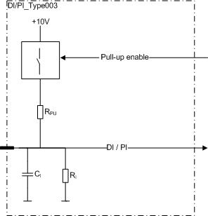 This type of pin is a ground referenced input (DI) including a pulse counting (PI) feature.