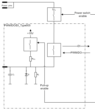 When using this type of pin, the related power switch must be switched on as well. See related power switches in section I/O List table's column named Group. Before the supply voltage can be connected to an output pin, the related power switch must be on. If the related power switch is off, the pin's input state is 1 (TRUE).
