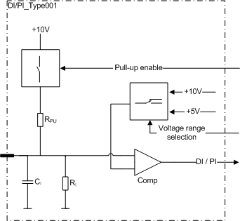 This type of pin is a ground referenced input (DI) including a pulse counting (PI) feature.